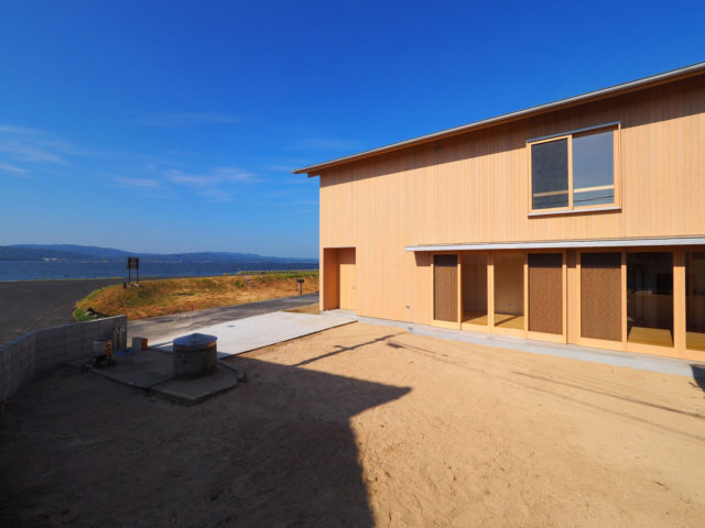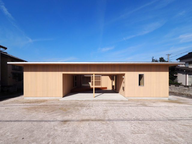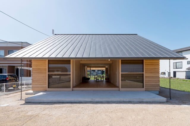 木村智彦 / グラムデザインによる、鳥取・東伯郡の「田後のアトリエ住居」。長閑な環境に建つ作家夫婦の為の住宅で、長い時間を掛け育っていく“素”の状態の建築を求めて素直な形・簡素な素材・素地仕上げの建築を志向、加えて大屋根と大気積居間が安心感と求心力を生み出す
