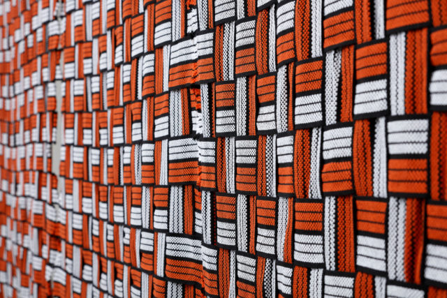 日本の伝統的な木工技法”ウヅクリ”によって生まれた凹凸の木の表面に、3色の塗料を地層のように塗り重ね、さらに凹凸を作った後、その凹凸を研磨する。研ぎ磨かれてフラットになった面には、3色で構成された年輪の模様が浮かび上がる。日本の青森に伝統的に伝わる漆の津軽塗から発想を得て、同じく伝統的な木工技法ウヅクリとミックスしできあがった新しい手法。使用している塗料は、日本のペイントメーカー、ポーターズペイントさんの協力により、施工時に使い切れずに余ってしまい用途に困っている塗料を集めた。