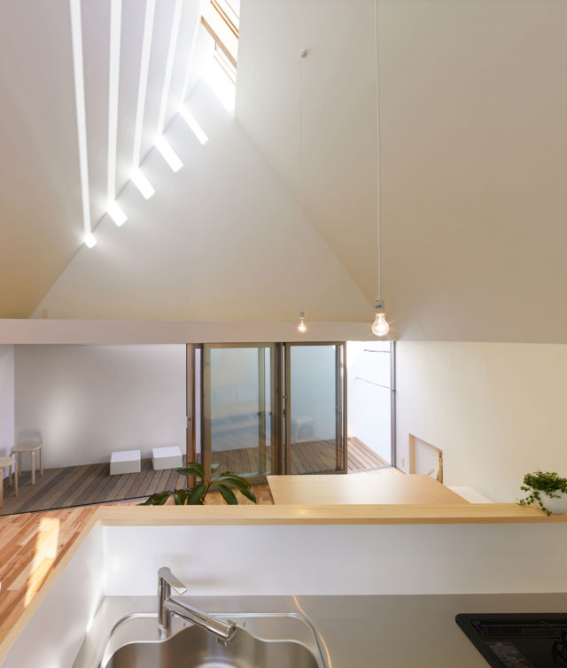 建坪が10坪という都内市街地の狭小地に建つ2住戸3階建ての賃貸長屋。北側斜線と道路斜線から生まれた家型ボリュームに、平面上にS字の界壁を設け東西に住戸を分ける。 2つの住戸は平面的に点対称の関係となっており、中に入ると全てが同じ間取りとなっている。 界壁を斜めに配置することにより、空間に広がりを与え、高い天井高と相まって小さい建坪を感じさせない内部空間が広がっている。 また、水まわりの各スペースが必要十分な平面サイズを確保されつつ、居住スペースは最大限の平面サイズを確保できることにも寄与している。 各住戸には大きなトップライトと壁面いっぱいの 開口部が設けられており、登り天井や斜めの界壁を伝って様々なかたちの光と影が作り出される。光と影の変化によって、そこに暮らす人は時の移り変わりを日常的に体感し、空間のやわらかい上昇感と相まって毎日が少し特別なものになる。