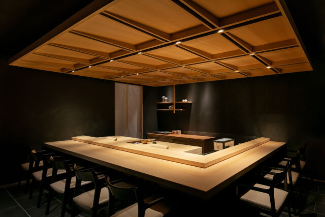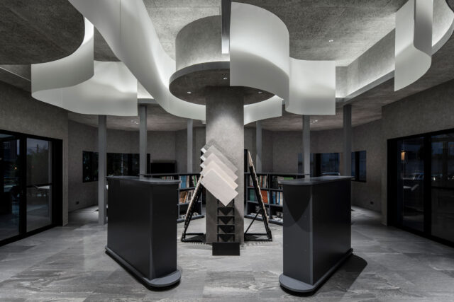 ・土間のコンクリートタイル:上足でも使用するためより滑らかな質感を追求し、大学の設備を使用して試作を繰り返しながら、艶のある大判のコンクリートタイル(1600×240×60mm、重さ70kg)を打設し敷き詰めた。