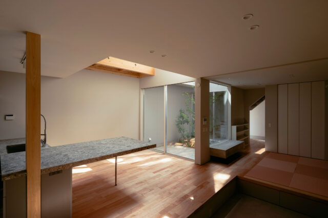 採光条件に厳しい敷地条件の中で、家全体に採光を確保するために、建物を高さの異なる4つのボリュームに分割して構成し、屋根と外壁の段差部分から家の奥まで南からの採光を計画した。1階リビングでは南側2階のインナーバルコニー越しに採光が得られ、バルコニーのプランターで栽培する花や観葉植物が鑑賞できる。