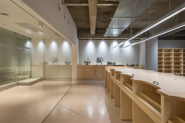二俣公一 / ケース・リアルによる、東京・江東区の店舗「Atelier Macri」。ギャラリー併設の眼鏡と香水の店。既存区画の空間を二つに分ける様な形を考慮し、様々な機能を集約する“コの字型”カウンターで空間を繋ぎ“一体感”を構築。クラシックなバーの様な在り方を想像して細部を設計