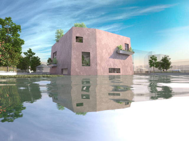 住宅地の角に建つ7戸の集合住宅。屋内外にわたって立体的に居住空間を組み合わせています。地上部には街路と一体化した大きなオープンスペースをつくり、住宅地への公共的な働きかけを試みました。建築の外形は、地上部を開放しながら容積を確保するために天空率を用いて設計しています。これにより、地上部のピロティだけでなく、凸凹のスカイラインや空に抜ける3階バルコニーが生まれました。これらの外部空間は、室内へと風を導くウインドキャッチでもあります。また、手摺や軒裏、踊場といった外部要素は、住まい手がカスタマイズできるように設計しました。住まい手が関わる屋外居住空間が建築の表情となり、それが立体的な街並みとして醸成される集合住宅を目指しました。
