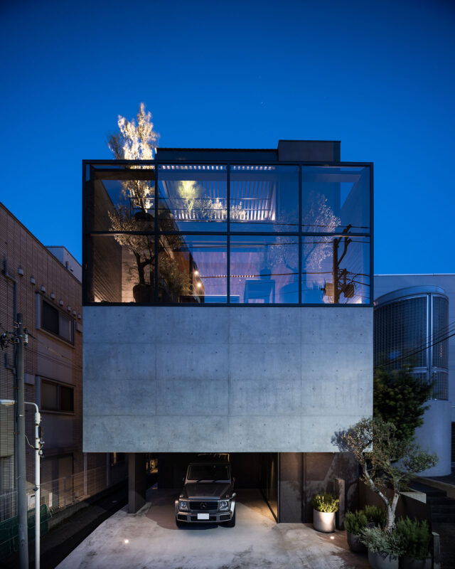 木 製門扉の内側にはRC壁で囲われたエントランスコートが現われ、夜には間接照明が主を出迎える。玄関ドア正面にはオブジェのような鉄骨片持ち階段を設え た。奥に広がるバスコートにはグレーチングを介して柔らかな拡散光が降り注ぐ。主に1階には浴室や個室を設え、全空間が中庭に面するよう計画した。子供室 の中庭にあるシンボルツリーのヒメシャラはファサードのアクセントにもなる。