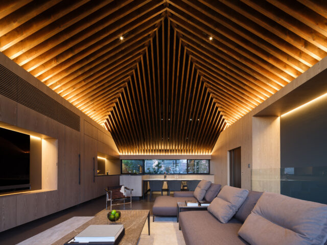 階 段を上がると2階の壁と天井を一体化する構造体が徐々に姿を現す。連続的に組み上げられた三角構面はSPFとLVLの組み合わせで構成され、床からスリー クッションで軒先まで繋がるシェル空間の内部には柱がない。また、開口部は木製4枚引戸とし、バルコニー手摺を透明強化ガラスを用いて高い開放性をつくり あげた。妻側の家具内にキッチンやリビングの諸機能が収納され、色を白にすることで構造体とのコントラストをつくり出す。