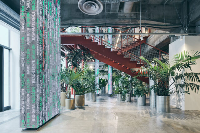 この期にあたかも一気に塗ったかのような、ビル外壁にまで至るこの赤。実は外壁部分は元から塗られていた。その赤は鰹節を割った時に現れる赤であることから、我々はそれを背景と捉え直し、ビル全体がお店の顔となるように、中心となる部屋の構成要素と同じ赤のカラーMDFで木箱を作った。木箱を積み上げることで、市場のような空間を構成した。