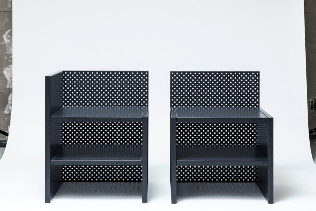 ひっくり返してスタッキングする最小限の3面だけで構成されたスツールとトロリー。トロリーはホームランボールを飾る3本脚のバットのような構成になっていて、ネフ社のおもちゃのようにスツールを彫刻的にスタックすることができる。