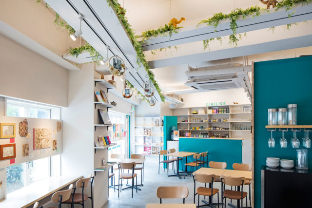 壁塗装や什器は施主による施工で、全体的なラフさと展示棚の抽象度が対比的な関係を生まれている。