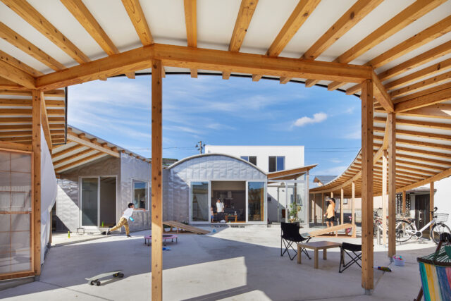 秋田の名湯、鹿角市の大湯温泉のための、物販、カフェ、野外劇場、公園、足湯、ビオトープとが一体となった地域交流施設。地域の伝統工芸として知られる「曲げわっぱ」にヒントを得て、リング状のLVL(単板積層材)を構造体として用いた。このリングの集合した透明な構造壁は、パーティションとしても、棚としても機能する。これにより木造の大屋根の下にプログラムに応じて変化する流動的空間を生成することができた。