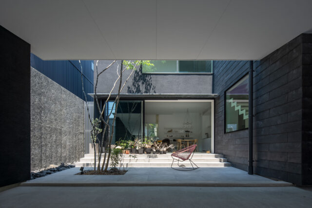 石川素樹建築設計事務所による、東京・小金井市の「中町の家」。人や車の往来はあるが自然が近い敷地。開くか閉じるかの“二項対立ではない”在り方を求め、光や影の変化と平面構成での“奥行きのある佇まい”を志向。“可動式ルーバー折戸”は外部と中庭の繋がりを調整