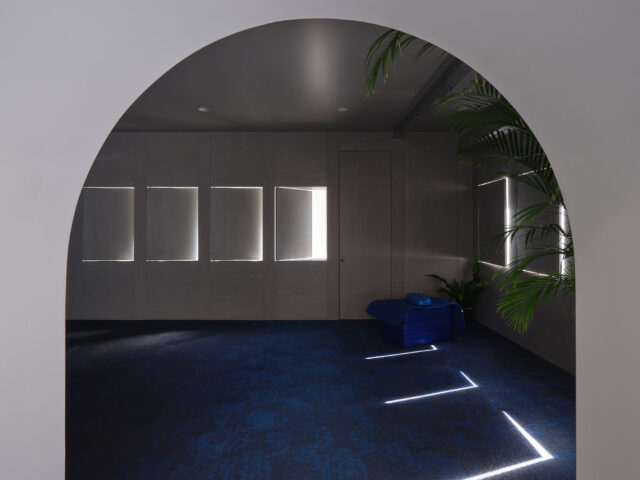 一方で、素材、反射、家具の寸法・配置については細かくスタディを重ね、自然光と風を部屋中で感じられるように、慎重に設計を進めていった。一つ間違えれば障害になりかねない大きな家具を、どのように暮らしに馴染ませ優しく見せるか。それを解決するために、家具には素材を生かした鏡面加工を施し、各所に散りばめられた植栽や、家具、振る舞いといった暮らしの風景を映り込ませながら、光を空間全体に拡散させるようにした事で既存環境との一体感を生み出している。収納扉同士は意図的に段差が生まれるように組まれており、部屋の中でも見る角度によって徐々に表情が変わるようになっている。