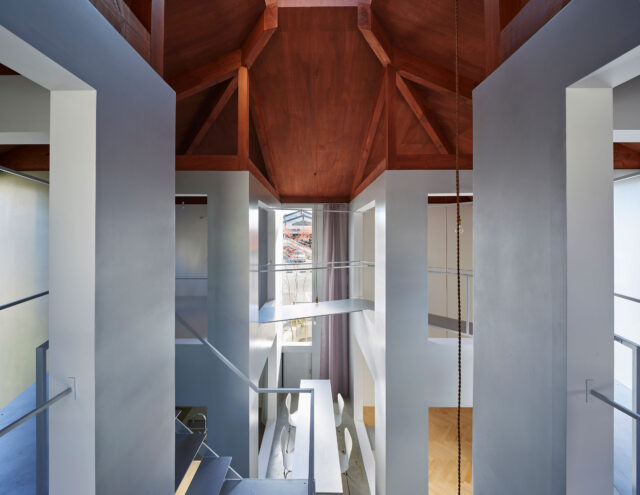同時に、吹抜け上部には、東棟・西棟を結ぶために90㎜L型鋼と厚さ6㎜の鋼製プレートの組み合わた薄いブリッジをジグザグに架け渡した。東棟・西棟をつなぎ回遊させる事で内部空間での人の身体性や好奇心を促す仕掛けとし、高さレベルでのホールとのつながりや視点の違いによる変化を与えた。また、STハンガーや手摺といった部材も付加し、余白や冗長性としての役割を吹抜けホールへ組込んだ。