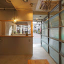 静岡県熱海市の海へと繋がる熱海銀座通り商店街に面するオーガニックカフェ。間口が5mほどの既存店舗は、熱海の芸者さんが通った小間物屋(椿油や白粉等を扱う)がルーツの調剤薬局。今回はその1/4ほど(間口2.5mx奥行き5m)をオーガニックカフェへと改装した。通りに面した店頭販売を主としているが、厨房裏のカウンター席、テーブル席、長手方向の木フレームを利用したロングカウンターと様々な客席を用意。薬局との仕切りには網入り型板ガラス霞クロスを用いることで互いの光と気配を感じることができる。またこのガラスは18cm幅の横桟毎に、湯けむりが立ち上るが如く垂直方向の角度を振ることで、薬局側では商品棚のスペース、カフェ側ではカウンタースペースをつくりだしている。この角度の異なるガラスには、カフェの照明の反射光はもちろんのこと、薬局側の様々なカラーの化粧品サインがぼやけて透けたり、通りを走る車のライトやアーケードの光が交差する。単層の仕切りでありながら湯けむりのような多層で複雑なひろがりをつくりだしている。コストを抑えるために天井には極力手を加えないこととした。よって既存の空調機や照明を利用するために仕切り壁の上部は金網となっている。厨房内の壁に掛けられた雲のような棚や照明フードは茅ケ崎在住の彫刻家である岡田健太郎氏によるもので、線による印象的な陰影を空間に与えている。厨房の壁はアルミで覆い、光る目玉を二つ通り側に設けることで商店街の賑わいに参加している。