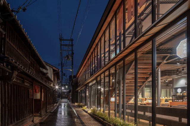 内藤廣建築設計事務所の建築設計による、奈良市の複合商業施設「鹿猿狐ビルヂング」。素材と寸法の操作によって歴史的町並みと対話することを意図