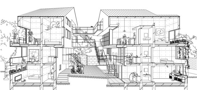このように集合住宅のスケールを調整して住宅に擬態させ、住宅地に紛れる新築計画と現存するコンテクストとの間に持ちつ持たれつの関係を築くことで、この地域が継承してきた空間の質を持続させようとしている。