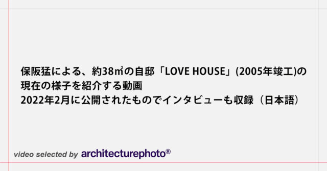 保坂猛建築都市設計事務所が設計した、東京の、延べ床約18m2の自邸「LOVE2 HOUSE」の高クオリティな動画です。制作は一条。保坂の解説(日本語)も収録されています。保坂のサイトで写真と図面も見ることができます。保坂は2005年に「LOVE HOUSE」という一件目の自邸を立てており、本作品は2件目の自邸です。