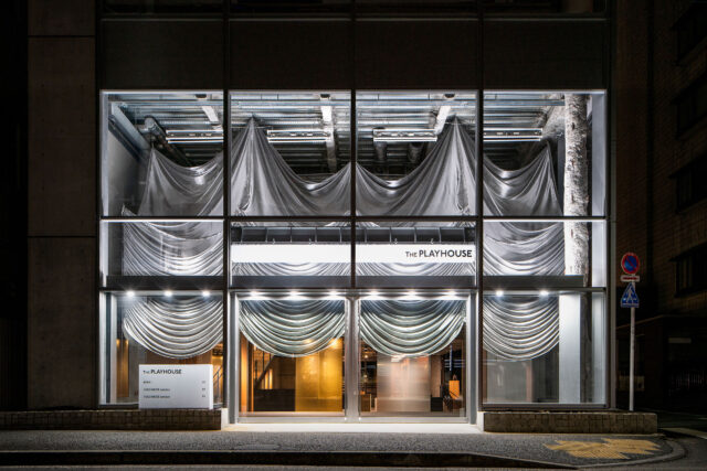 通り側正面には、4mの天井高を活かした大開口、もう一面には建物のフロア数を錯覚するような小窓を配し、同規模の低層住宅や店舗が建ち並ぶ中、スケール感のずれが際立つファサードを計画した。大小の窓が、ショップのショーウインドウとなって外の通りに中の様子を漏れ伝え、飲食店においては窓際席になるなど、建物内外で業態に合わせて効果的に働く。1階の大きな窓の前にある、敷地の高低差によって生まれた基壇がベンチとしても利用でき、建築を通りに開く。内部空間から外へと目を向けると、通りを歩く人や、市街地にあっても大きく切り取られた空が望め、フレーミングされた風景が取り込まれる。荒々しいコンクリート洗い出しの外壁と、ラワンの普通型枠による内部壁面に対し、窓周りは平滑なコンクリートで仕上げて、額縁としての効果を高めている。