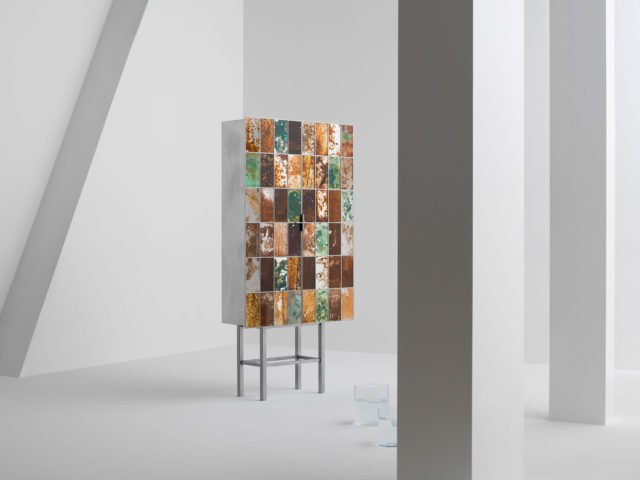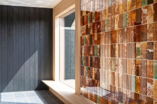 与えられた面に対して、グラフィカルに絵を描く感覚で1枚1枚模様の異なる Rust Harvest のピースをレイアウトしていく。このシステムを垂直面に施せば壁やパーテーションになり、水平面に施せば座面やテーブルトップにもなり得る。あらゆる空間やプロダクトに応用でき、Rust Harvest の1ピースの大きさや厚み、目地の幅は様々なサイズに製作可能である。