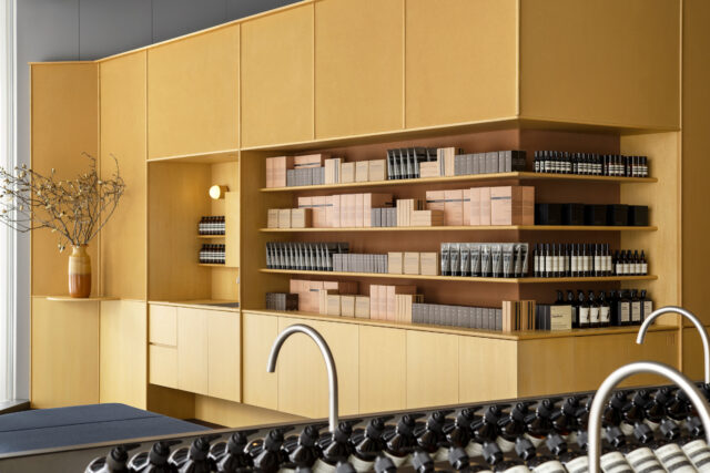 また、カウンターに並ぶハイチェアはこの場所のためのオリジナルチェア。レーベルの頭文字であるMをモチーフに、補強材を入れて特徴的な後ろ姿をデザインした。