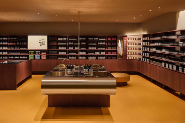 。建築家は、棚を空間全体を包み込むように配置し、琥珀色の瓶のライトアップで通行人の視線を引寄せる計画を考案しました。また、時を経た鉱物を用いたテーブルは熟成された商品との親和性も考慮されました。店舗の場所はこちら(Google Map)。