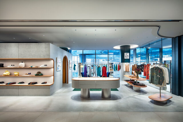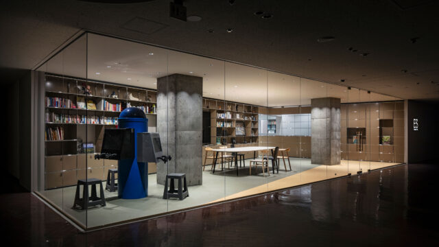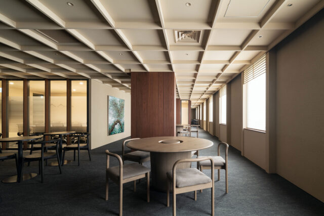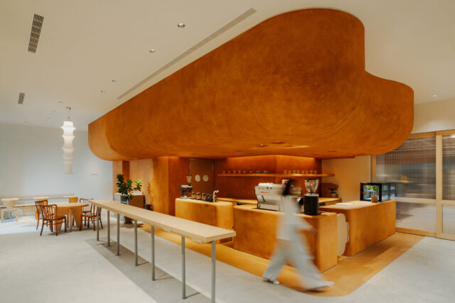 For the flooring, we laid a brown, felt-like carpet, offering visitors a sense of soft comfort the moment they step off the hard surface of the urban pavement outside.