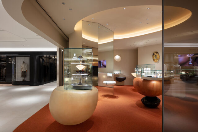 In contrast to the lively urban context and the imposing presence of the building’s upper floors, the façade features a softly drawn, large arc. This element creates a calm and composed atmosphere through its contrast with the existing black exterior while the beautifully lit transparent amber whisky bottles catch the eyes of passersby.