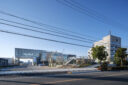 矢野青山建築設計事務所による、愛媛・松山市の「だんだんPARK」。カーディーラーの建替計画。自動車を取巻く“環境の変化”に向き合い、用途の提案まで行って多目的ホール等を内包する“公共的な場”を志向。様々な用途の入る“5つのBOX”がズレながら重なる構成の建築とする外観、北側の道路より見る。 photo©西川公朗