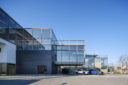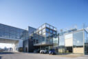 矢野青山建築設計事務所による、愛媛・松山市の「だんだんPARK」。カーディーラーの建替計画。自動車を取巻く“環境の変化”に向き合い、用途の提案まで行って多目的ホール等を内包する“公共的な場”を志向。様々な用途の入る“5つのBOX”がズレながら重なる構成の建築とする1階、整備工場 photo©西川公朗
