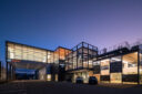 矢野青山建築設計事務所による、愛媛・松山市の「だんだんPARK」。カーディーラーの建替計画。自動車を取巻く“環境の変化”に向き合い、用途の提案まで行って多目的ホール等を内包する“公共的な場”を志向。様々な用途の入る“5つのBOX”がズレながら重なる構成の建築とする外観、ドックスペース側より見る。夜景 photo©西川公朗