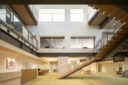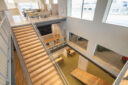 矢野青山建築設計事務所による、愛媛・松山市の「だんだんPARK」。カーディーラーの建替計画。自動車を取巻く“環境の変化”に向き合い、用途の提案まで行って多目的ホール等を内包する“公共的な場”を志向。様々な用途の入る“5つのBOX”がズレながら重なる構成の建築とする3階、2階への階段を見下ろす。 photo©西川公朗