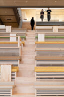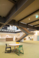 矢野青山建築設計事務所による、愛媛・松山市の「だんだんPARK」。カーディーラーの建替計画。自動車を取巻く“環境の変化”に向き合い、用途の提案まで行って多目的ホール等を内包する“公共的な場”を志向。様々な用途の入る“5つのBOX”がズレながら重なる構成の建築とする1階、「だんだんホール」、2階への階段と客席 photo©西川公朗