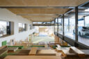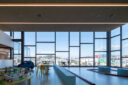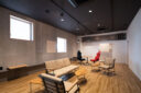 矢野青山建築設計事務所による、愛媛・松山市の「だんだんPARK」。カーディーラーの建替計画。自動車を取巻く“環境の変化”に向き合い、用途の提案まで行って多目的ホール等を内包する“公共的な場”を志向。様々な用途の入る“5つのBOX”がズレながら重なる構成の建築とする2階、GRラウンジ photo©西川公朗