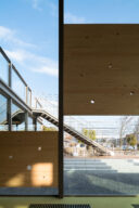 矢野青山建築設計事務所による、愛媛・松山市の「だんだんPARK」。カーディーラーの建替計画。自動車を取巻く“環境の変化”に向き合い、用途の提案まで行って多目的ホール等を内包する“公共的な場”を志向。様々な用途の入る“5つのBOX”がズレながら重なる構成の建築とする2階、屋外テラスよりドッグスペースを見下ろす。 photo©西川公朗