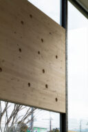 矢野青山建築設計事務所による、愛媛・松山市の「だんだんPARK」。カーディーラーの建替計画。自動車を取巻く“環境の変化”に向き合い、用途の提案まで行って多目的ホール等を内包する“公共的な場”を志向。様々な用途の入る“5つのBOX”がズレながら重なる構成の建築とする1階、「だんだんホール」、開口部の詳細 photo©西川公朗