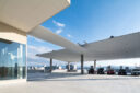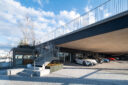 矢野青山建築設計事務所による、愛媛・松山市の「だんだんPARK」。カーディーラーの建替計画。自動車を取巻く“環境の変化”に向き合い、用途の提案まで行って多目的ホール等を内包する“公共的な場”を志向。様々な用途の入る“5つのBOX”がズレながら重なる構成の建築とする2階、屋外のGR展示スペース photo©西川公朗