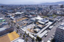 矢野青山建築設計事務所による、愛媛・松山市の「だんだんPARK」。カーディーラーの建替計画。自動車を取巻く“環境の変化”に向き合い、用途の提案まで行って多目的ホール等を内包する“公共的な場”を志向。様々な用途の入る“5つのBOX”がズレながら重なる構成の建築とする鳥瞰、北西側より見下ろす。 photo©西川公朗