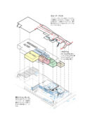 矢野青山建築設計事務所による、愛媛・松山市の「だんだんPARK」。カーディーラーの建替計画。自動車を取巻く“環境の変化”に向き合い、用途の提案まで行って多目的ホール等を内包する“公共的な場”を志向。様々な用途の入る“5つのBOX”がズレながら重なる構成の建築とするプログラムダイアグラム image©矢野青山建築設計事務所