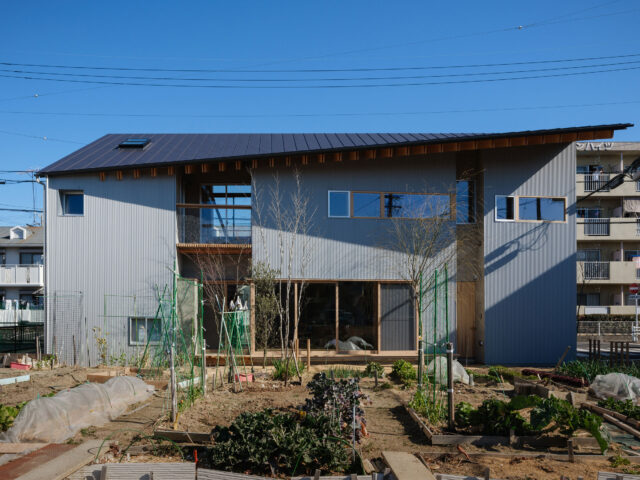小林玲子 / kitokino architectureと野海彩樹建築設計舎による、愛知の「安城の住宅」。郊外の住宅街に計画。敷地内で完結しない住居を目指して、周囲のスケールと連続し隣接する畑に開く“屋根”や風景を内部に取り込む“窪み”を考案。見慣れた景色の魅力発見の契機となる事も目指す