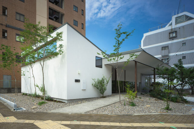 小林玲子 / kitokino architectureによる、大阪市の住宅「新森の四辻」。幹線道路の交差点に接する音楽室のある住居。最大限の自然採光と内外の適切な接続を目指し、多様に外部と面する“L型”平面を組み合わせる構成を考案。音楽が溢れ庭が道と繋がり街に彩りを添える