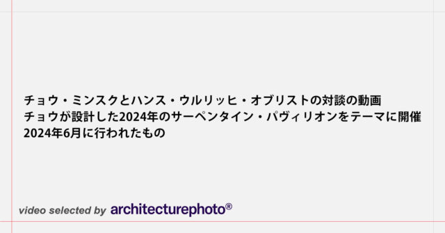 チョウ・ミンスクとハンス・ウルリッヒ・オブリストの対談の動画。チョウが設計した2024年のサーペンタイン・パヴィリオンをテーマに開催。2024年6月に行われたもの