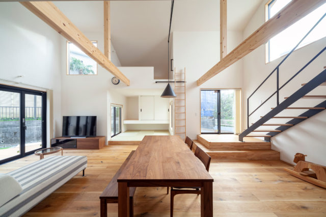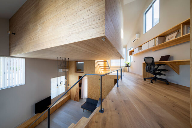 寝室、LDK、水回り、収納と必要な諸機能はあったものの、各部屋の大きさをパズルのように当てはめていくような計画ではなく、敷地いっぱいに設定した建物平面を、対角線で分割し床をズラすということで住宅を作った。