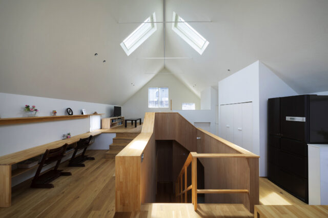 北側斜線や敷地形状や目の前の景色、様々な要因から引かれた斜めの線が重なる空間は、四角い部屋の連続とは異なり、少し歩くと空間が大きく広がったり閉じたり、振り向くと全く予想していない空間だったりと、私たちが慣れている水平直角な空間とは異なる体感がある。