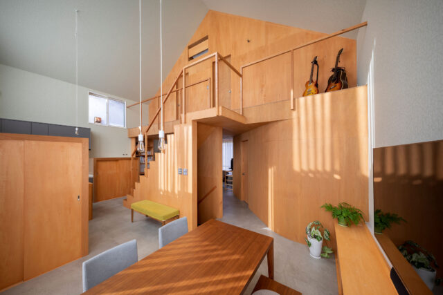 一方で、必要以上に天井の高い玄関ホールや収納空間、寝台列車のような寝室、洞窟の奥のような水回り、こもった感じのリビング、天井の高いダイニング、山の上から見下ろすようなロフト等、一見機能には無関係のようだが、ある種の心地よい、機能と空間のズレが生まれ、変に丁寧にデザインされ、用意された空間よりも清々しいような、心地よさがあるとも感じた。