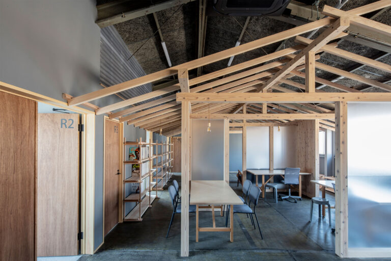 高橋勝建築設計事務所が設計した、京都市の、既存倉庫を改修したコワーキング等施設「太秦トキワ荘」です。主宰者のテーマに応え、創作者のための空間に求められる設えや交流のきっかけが生まれる仕掛けを、地域産の木材を用いてつくりだす事が意図されました。施設の公式サイトはこちら。