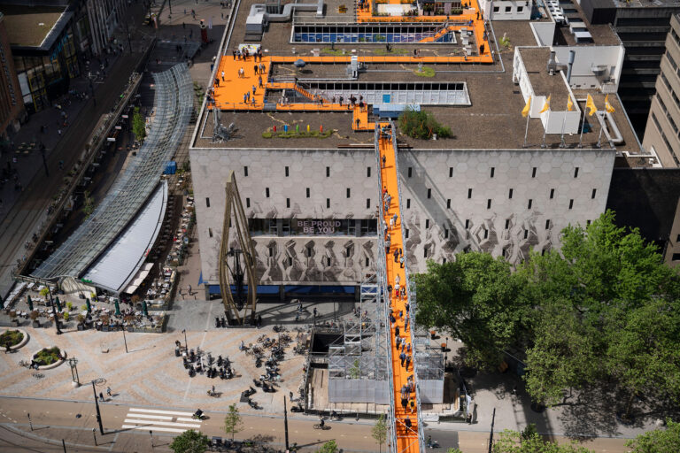 昇天祭の今日、ロッテルダム・ルーフトップ・ウォークがオープンし、来場者は高さ30メートルのさまざまな屋根の上を冒険しました。ロッテルダム・ルーフトップ・デイズとMVRDVがデザインしたこのインスタレーションのハイライトは、ロッテルダムで最も重要な通りの一つであるクールシンゲルに架かる橋です。ルーフトップ・ウォークは、一般の人々に街に対する新しい視点を提供することを目的としています。屋根は、都市をより住みやすく、生物多様性に富み、持続可能で、健康的なものにする「第二の層」となり得るのです。