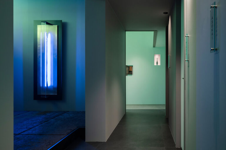 スペースは、クリエイティブな働き方を意識した回遊動線によって結ばれ、視線の抜けや天井・フロアに高低差をつけることで、各スペースに個性や変化を持たせた。スペース間の移動にともなって展開するシークエンス、ライム色に変換された風景、ネオンアートの幻想的な光の演出、開口部から差し込む自然光が、感性や創造性を刺激する。