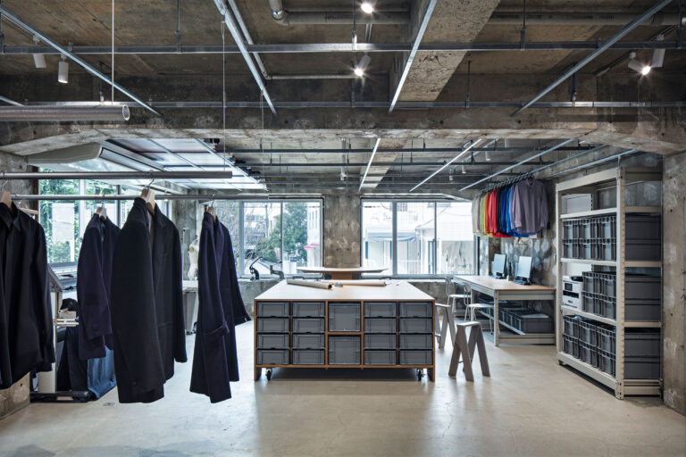 衣料品ブランドの直営店併設のスタジオです。建築家は、技術に定評がある同社の“素の現場”に価値を見出し、“直接作り手から話を聞いて服を買う”空間を志向しました。そして、“商業的な顔”の作り込みではなく“即興的”に設計する事も意図されました。ブランドの公式サイトはこちら。