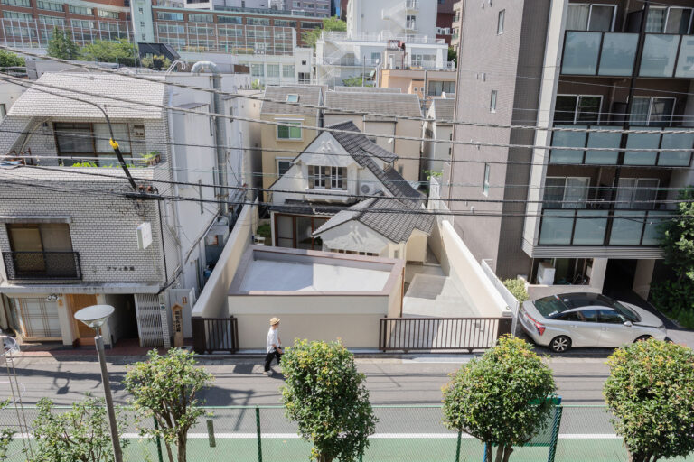 さらに、隣地の駐車場が近いため目隠しを求められた階段横の窓には、インナーサッシを設置して残った僅か1.5cmの窓枠の隙間に、アルミと寒冷紗で製作した引戸を設置して視線を遮りつつ柔らかな光を得た。これらの要素は時間や季節による周辺環境の変化と連動して、その時がいまここにしかない瞬間であることを思い出させてくれる。