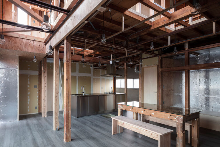 若い施主夫婦が購入した木造住宅の改修です。建築家は、初期から“穴を穿つ”と“引き剥がす”設計を志向しました。そして、上階床に“穴”を開けて“家族の気配が感られる”空間を構築し、壁を“剥がし”既存躯体と親和性のある素材で仕上げました。