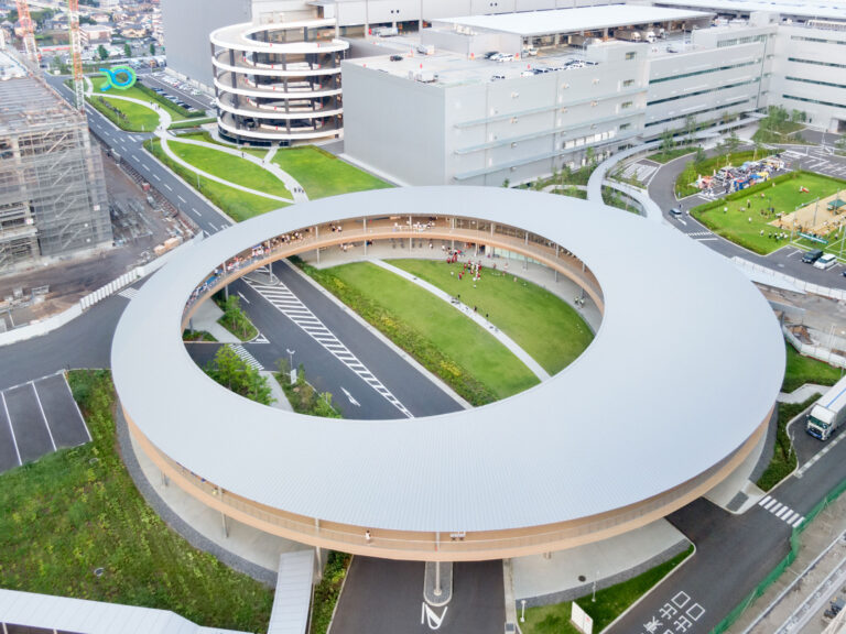 佐藤可士和 / SAMURAIと竹中工務店による、神奈川の「GLP ALFALINK相模原」。総延床約67万㎡の物流拠点施設。存在意義の再定義と既存イメージの刷新を目指し、建物をブランディングの重要な“メディア”と捉えた設計を志向。情報や建築を開いて地域と企業に好循環を生む“共創”の場を作る アプローチから共用施設棟を見る。 photo©太田拓実